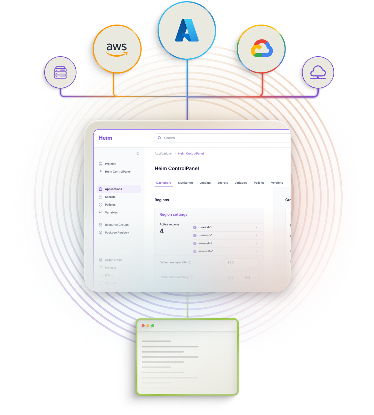 Heim works with AWS, Azure, Google Cloud, and your own datacenter or cloud environment, offering a single interface for managing multiple clouds. It automates microservice orchestration, and supports serverless functions, making deployment & management easy.